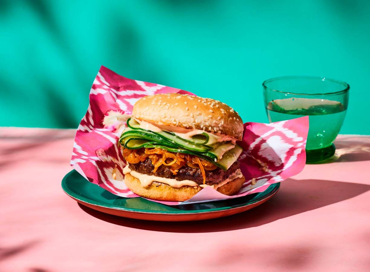 Een burger met door de Koreaanse keuken geïnspireerde smaken: BBQ kruiden, sesam en kimchi. Een cadeautje op een broodje.