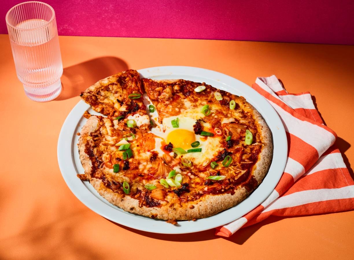 Wauw, da’s nog eens pizza barstensvol smaken! Knapperige kimchi, spicy chili oil, zoetige tomatensaus en een romig eitje als stralend middelpunt. En dat op een heerlijk knapperige pizzabodem.