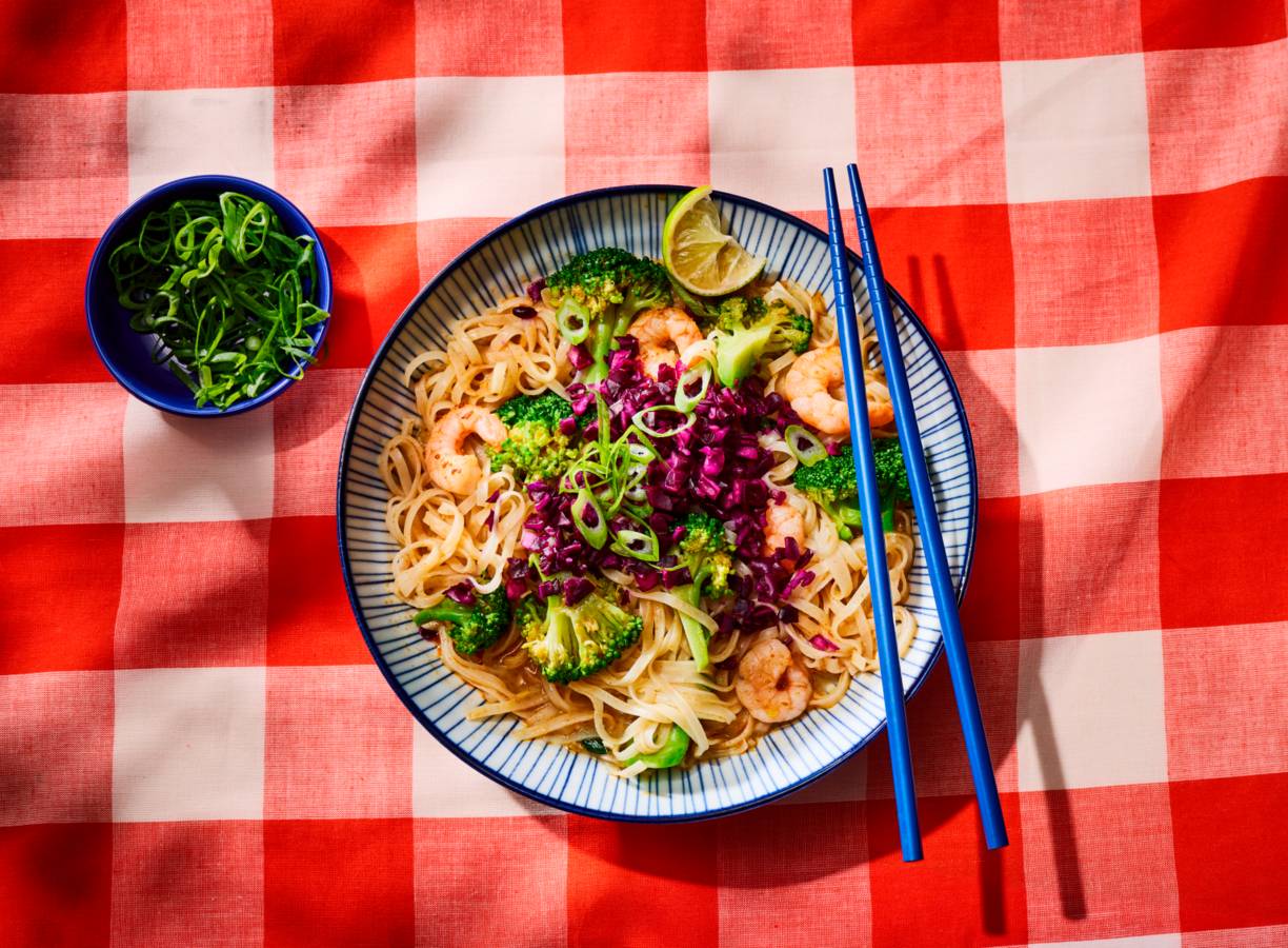 Schep de noedels in de kommen en verdeel de rode kool erover. Garneer met de rest van de bosui en de limoen.