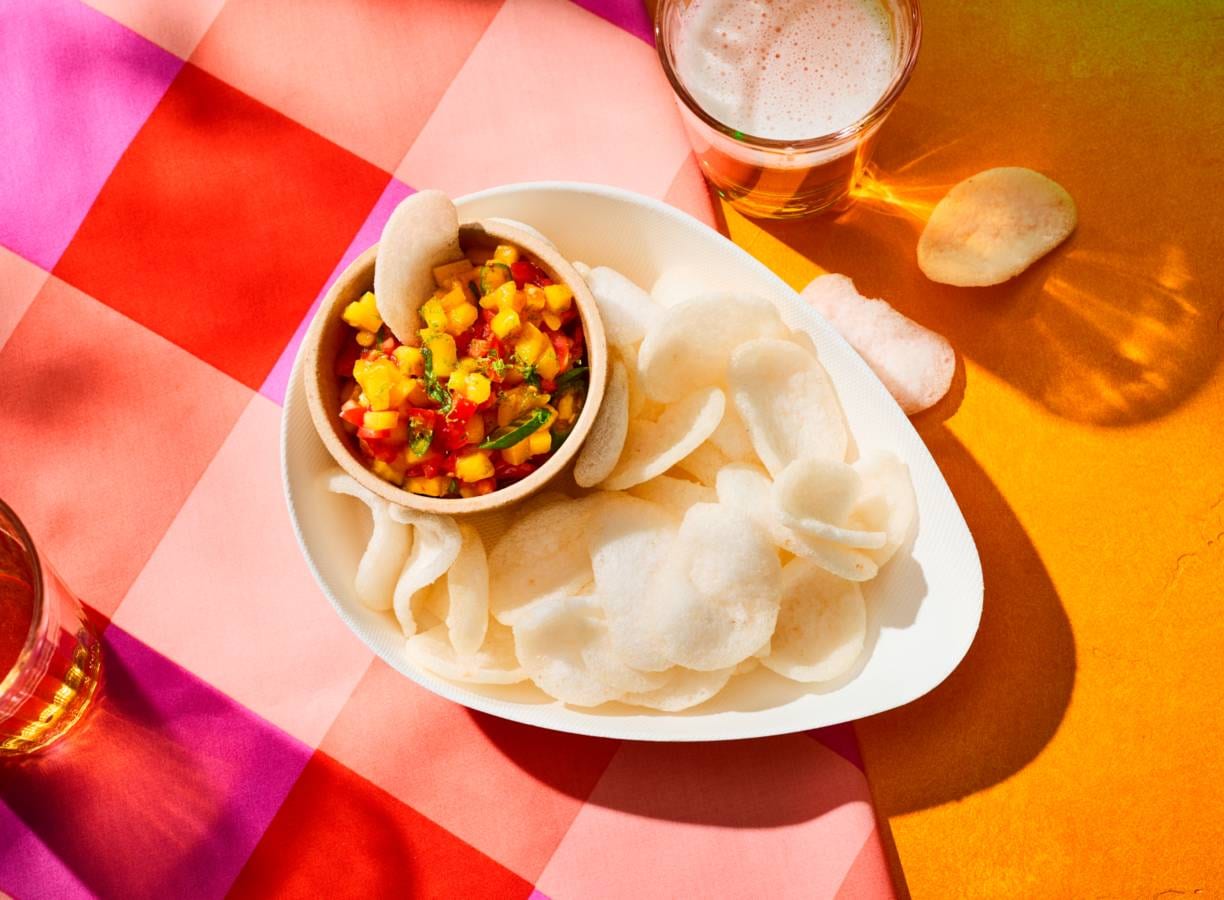 Als je toch al niet van de kroepoek af kunt blijven, maak er dan meteen een lekker dipje bij! Deze bijvoorbeeld, van mango, tomaat en sambal.