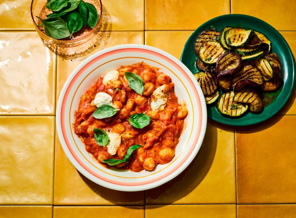 Pluk de blaadjes van het basilicum en bestrooi de gnocchi ermee. Serveer de gegrilde groente erbij.