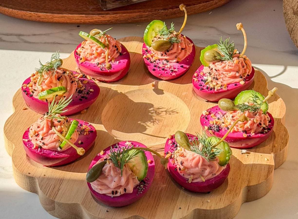 Deze gevulde eitjes stelen de show tijdens de brunch. Knalroze dankzij het bietensap en onweerstaanbaar met de everything bagel seasoning.