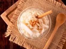 Deze rijstpudding kan op smaak gebracht worden met kaneel of bestrooid worden met kokoschips.