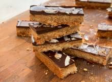 Smelt de chocolade met de rest van de kokosolie au bain-marie. Schenk de gesmolten chocolade over de notenlaag en bestrooi met de rest van de kokossnippers. Laat minimaal 30 min. opstijven in de vriezer. Haal uit de vorm en snijd in repen.