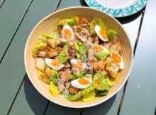 5. Haal de blaadjes van de romainesla los en meng met de rest van de dressing. Verdeel over een serveerschaal. Halveer de gegrilde kipdijfilets en leg op de salade. Verdeel de croutons, eieren en de rest van de Parmezaanse kaas erover. Serveer direct.