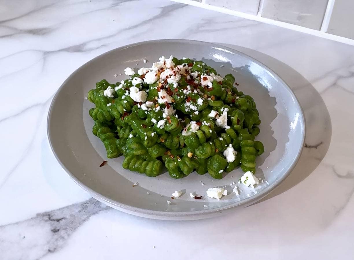 Deze green goddess pasta maak je met spinazie, cottagecheese en tuinerwten. Romig en eiwitrijk!