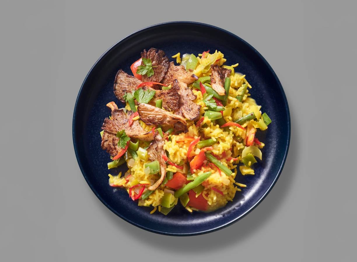 Verdeel de krokante oesterzwammen over de rijst met groenten en serveer.