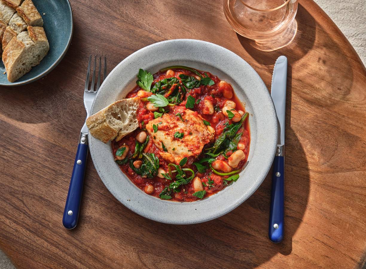 Niets fijner dan een pruttelende stoof op het fornuis. Lekker met kip, chorizo en cannellinibonen en een pittige tomatensaus. Met stokbrood én rode wijn voor een perfecte smaakcombinatie.