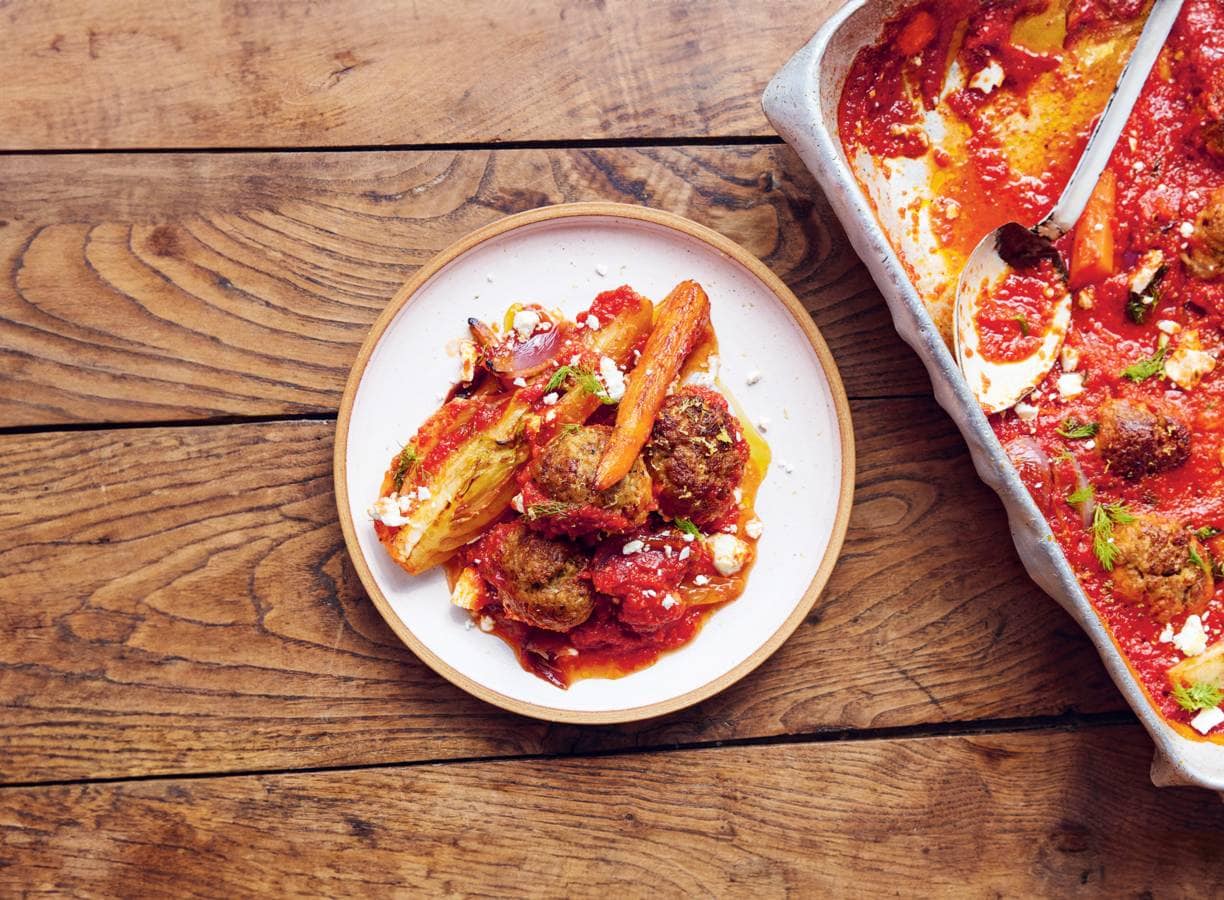 Deze traybake met gehaktballetjes, geroosterde venkel, wortel en feta is snel en makkelijk. Swap voor vegetarisch gehakt voor een veggie variant.