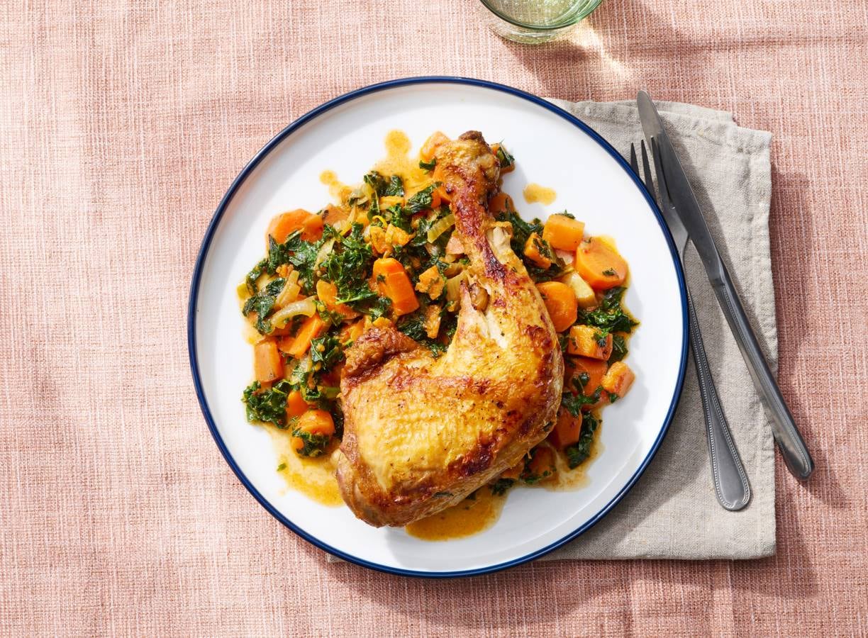 De herfstgroente: boerenkool, ui, wortel en zoete-aardappel. De stoof: kippenbouten, knoflook, ras el hanout en kaneel. Voor extra smaak nog een splash sinaasappelsap. Mogen we aanschuiven vanavond?