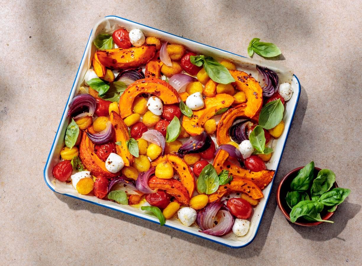 De hele regenboog op een bakplaat: deze traybake met gnocchi, pompoen, tomaatjes en mozzarella heeft het allemaal. Je schuift 'm zo de oven in en uit.