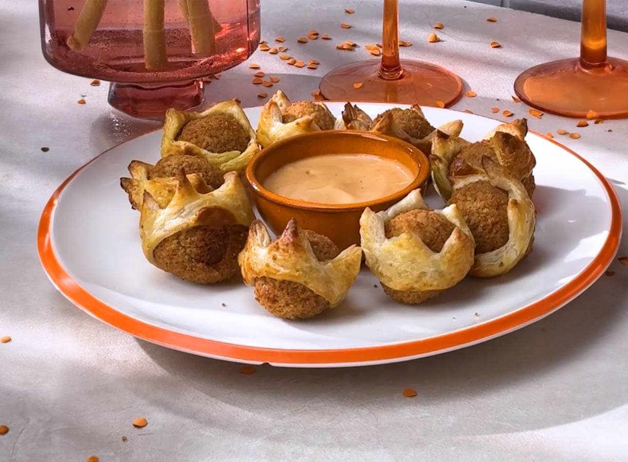 Wikkel telkens 1 reep bladerdeeg met de kartelkant naar boven rondom een bitterbal als een kroon en verdeel over een met bakpapier beklede bakplaat.