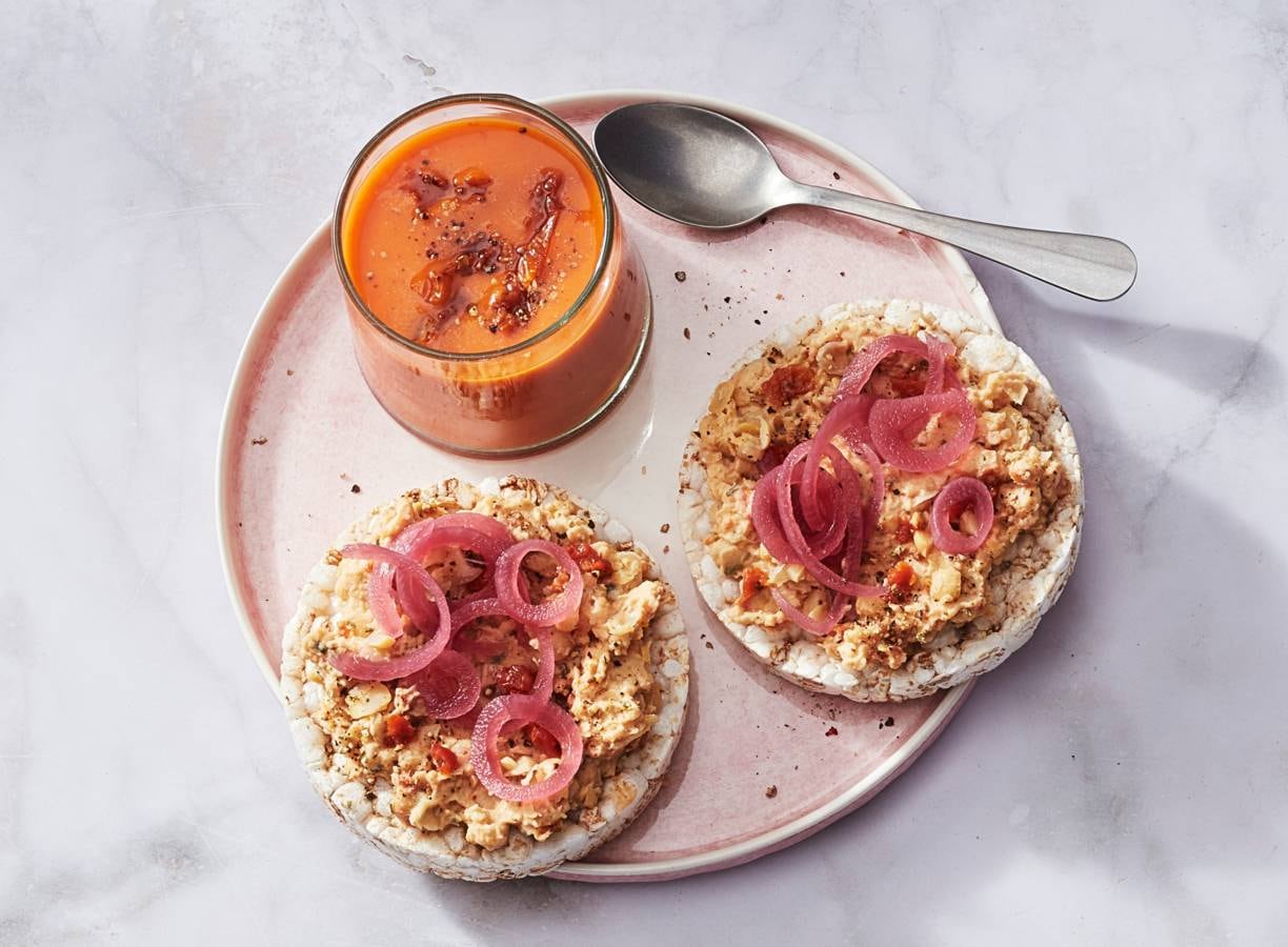 Besmeer de rijstwafels met de geprakte kikkererwten en verdeel de rode uiringen erover. Breng op smaak met peper. Doe de gazpacho in glazen, verdeel de rest van de gedroogde tomaten erover en peper en serveer bij de rijstwafels.