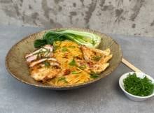 Kook de noedels volgens aanwijzingen op de verpakking gaar. Halveer de paksoi in de lengte en voeg de laatste 2 min. toe aan de pan met noedels. Giet af en vang een kopje kookvocht op.
