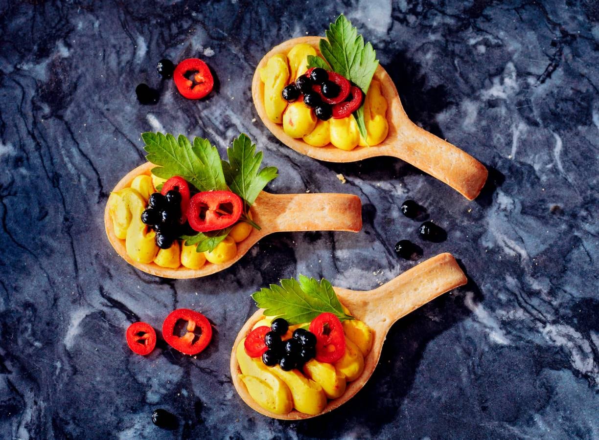 Deze feestelijke amuselepels gevuld met roomkaas in de smaak pittig gevuld eitje zijn gemakkelijk te maken. Maak de lepels af door er balsamico smaakparels aan toe te voegen en garneer ze met rode peper en verse platte peterselie!