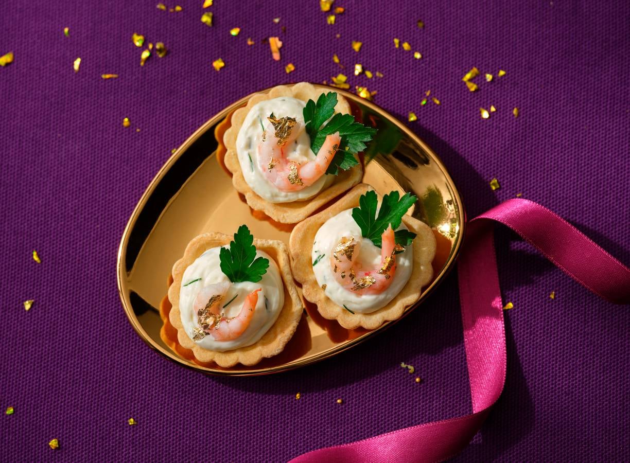 Deze feestelijke luxe mini coquilles zijn gevuld met truffel-roomkaas en gemaakt in een handomdraai. Serveer ze met wat verse bieslook en bestrooi met Grana Padano en een beetje glitterspray.