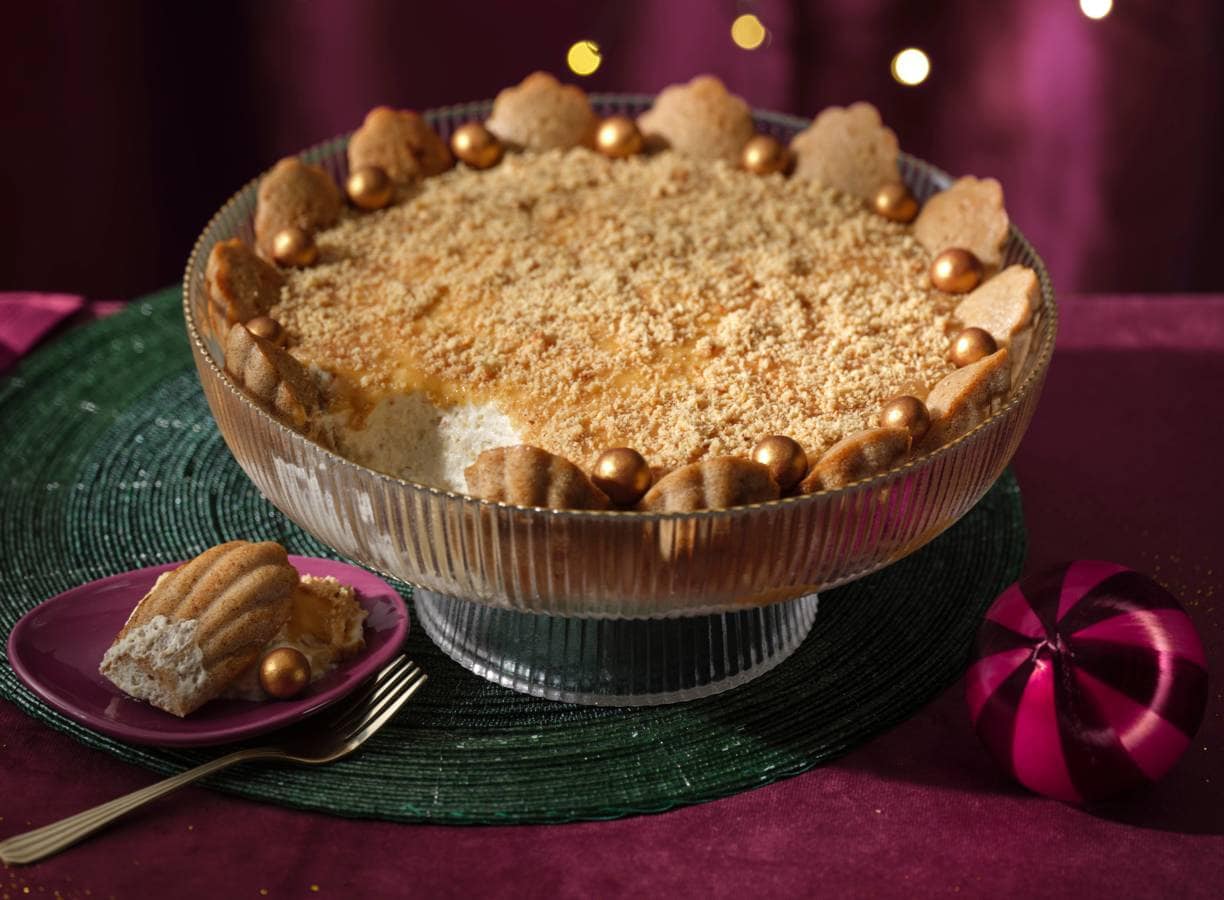 Spuit een klein beetje hazelnotenmousse over de rand van de bodem van de serveerschaal. Verdeel 14 madeleines tegen de randen (met ribbelkant naar buiten). Snijd de rest van de madeleines horizontaal doormidden en verdeel over de bodem. Spuit de rest van de hazelnotenmousse erover, verdeel de karamelsaus erover en bestrooi met de rest van de hazelnoten. Verdeel de gouden parels erover.