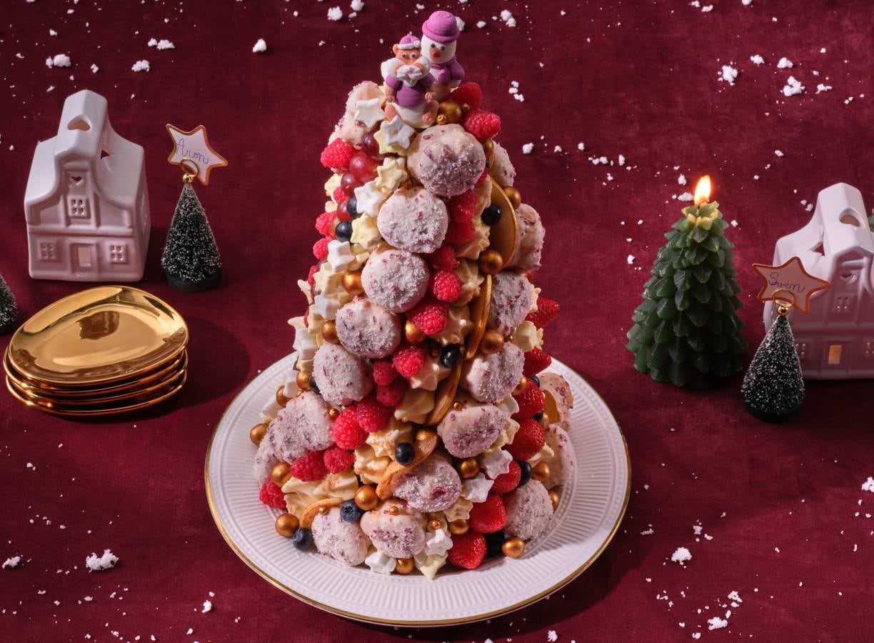 Een vrolijke serveertoren met kerstsoesjes, marshmallow-sterretjes, druiven, bessen en knapperige nashipeer. Met eetbare parels en een vrolijke kerstpiek wordt dit hét zoete nagerecht dat direct sfeer brengt.