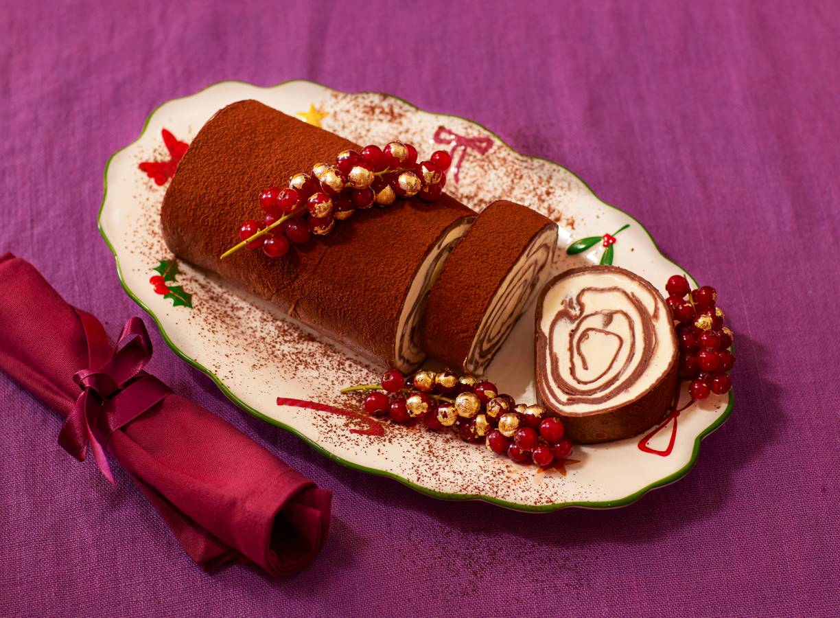 8. Haal de rol uit de vriezer. Verwijder de folie en snijd met een gekarteld mes 1 cm van de uiteinden af, deze gebruik je niet. Leg de rol op een serveerschaal, bestuif met de rest van de cacaopoeder en verdeel de rode bessen erover. Snijd in gelijke plakjes en serveer direct.