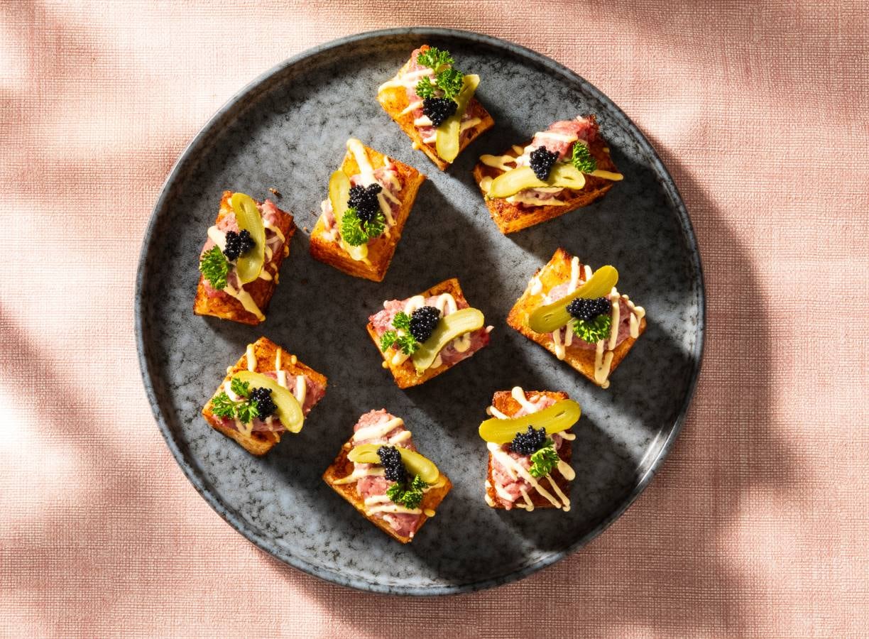 Start de avond met kleine hapjes zoals deze geroostere brioche met steak tartaar en een caesarressing. Nog wat mooie pareltjes on top voor een feestelijke touch en het diner is geopend.