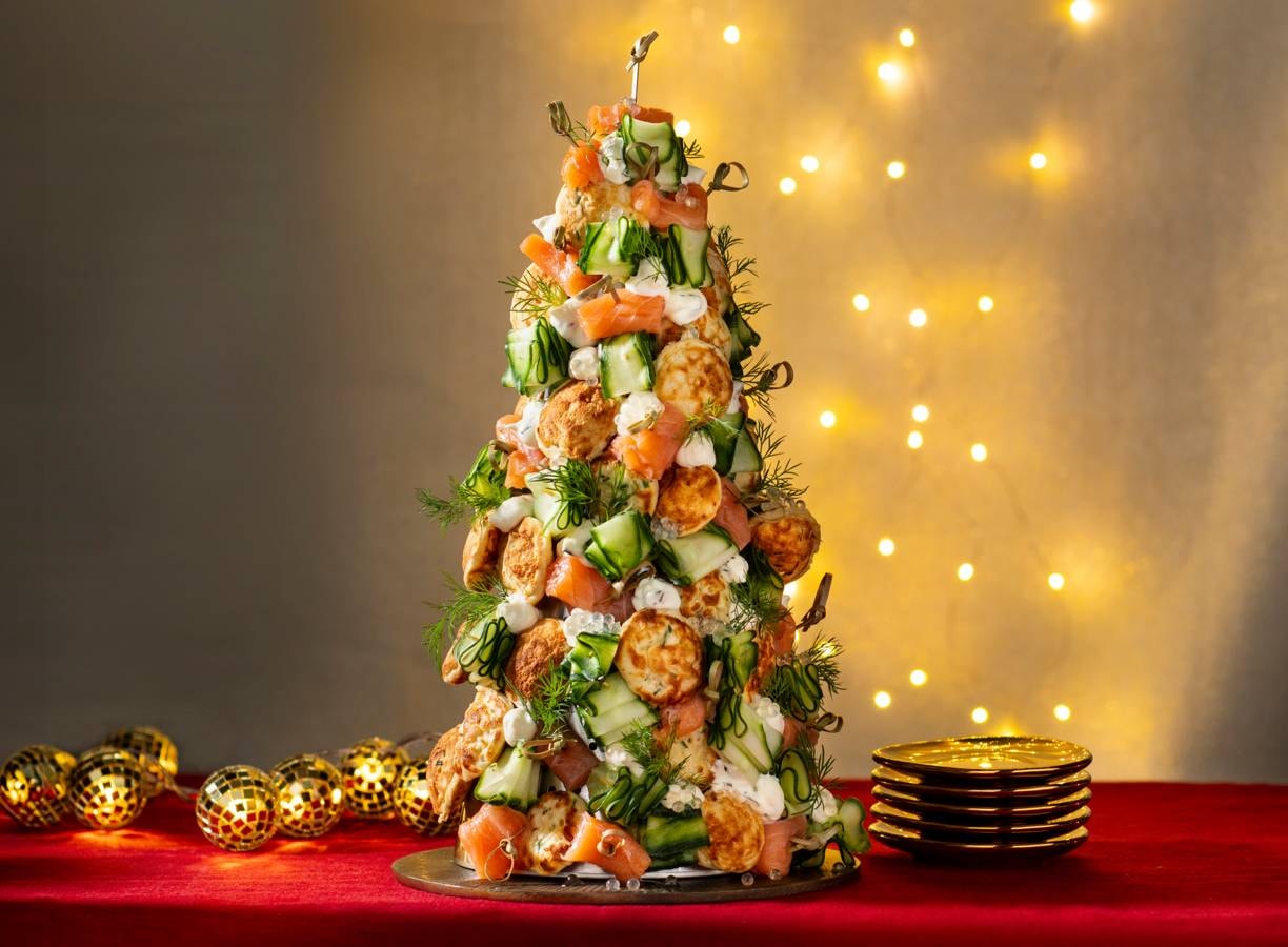 Kleine hartige poffertjes met geraspte kaas en gerookte zalm, afgemaakt met roomkaas, bieslook en citroenparels. Alles als feestelijke kerstboom geserveerd dus perfect om te delen.