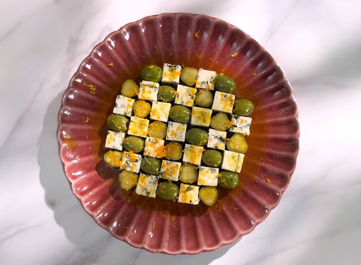 Snijd de blauwe kaas in blokjes van 2 cm en de augurken in plakjes van 2 cm dik. Verdeel de blauwe kaas, augurkplakken en olijven om en om in een cirkel op een serveerschaal.
