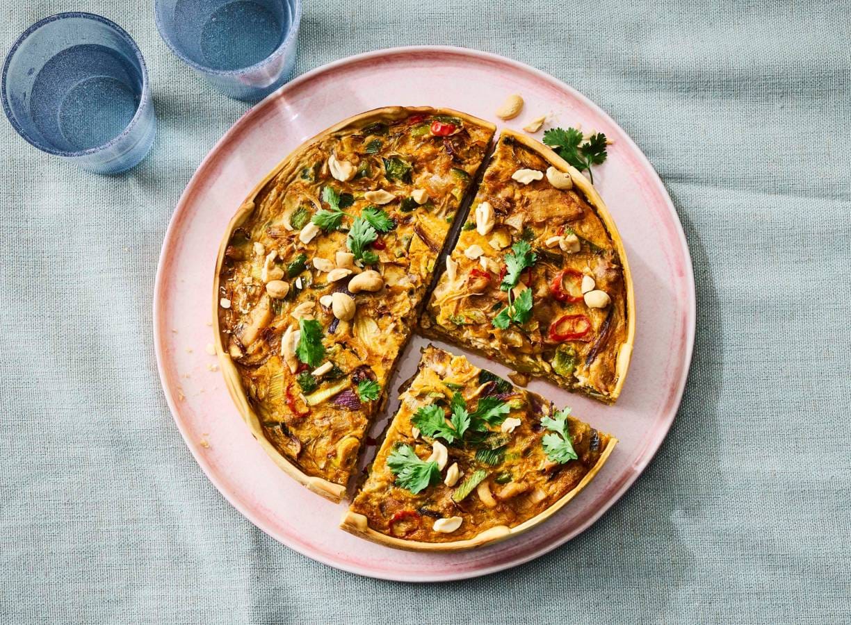 Curry meets quiche! Deze rode-curryquiche met kip is een licht pittige Thaise twist op je klassieke hartige taart. En hij staat binnen 20 minuten in de oven. Makkelijk en verrassend lekker!