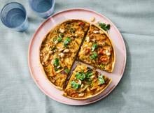 Hak ondertussen de cashewnoten en koriander grof. Haal de hartige taart uit de oven, laat 5 min. afkoelen en verwijder de springvorm. Bestrooi met de cashewnoten en koriander.