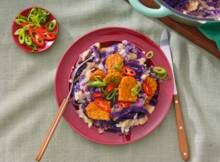 Snijd de bosui en de rest van de rode peper in ringen. Serveer de rodekoolstamppot met de gebakken tempeh. Bestrooi met de bosui en rode peper.