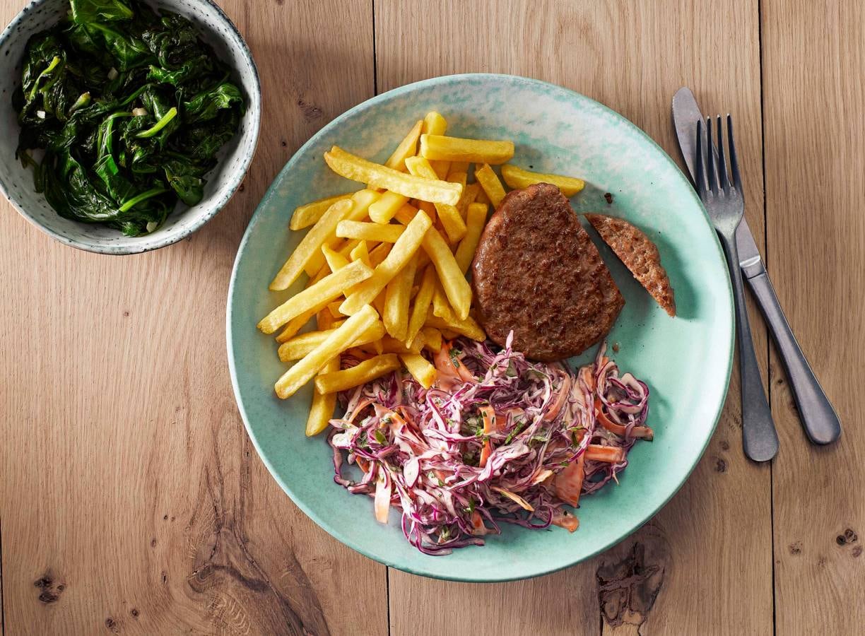 Een burger met friet is altijd goed, maar met coleslaw en gestoofde spinazie erbij wordt het nóg lekkerder. Krokant, romig en extra groente voor de balans.
