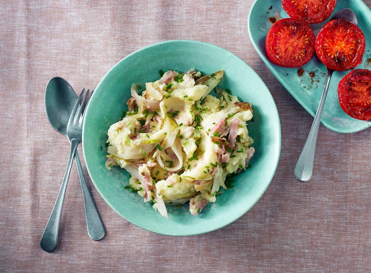 Witlofstamppot met ham, kaas en gebakken tomaat