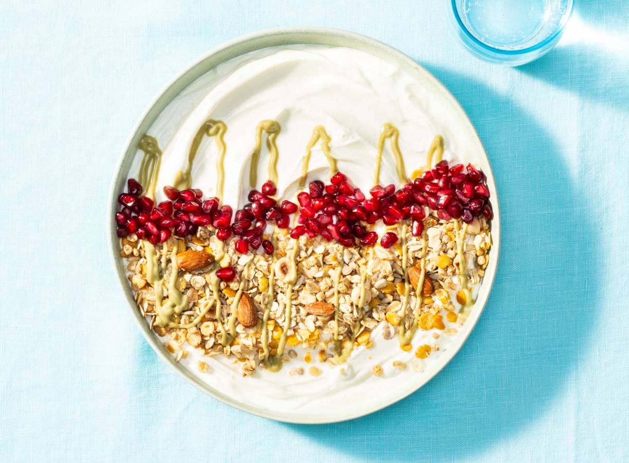 Skyrbowl met proteïne-granola en pistachedrizzle