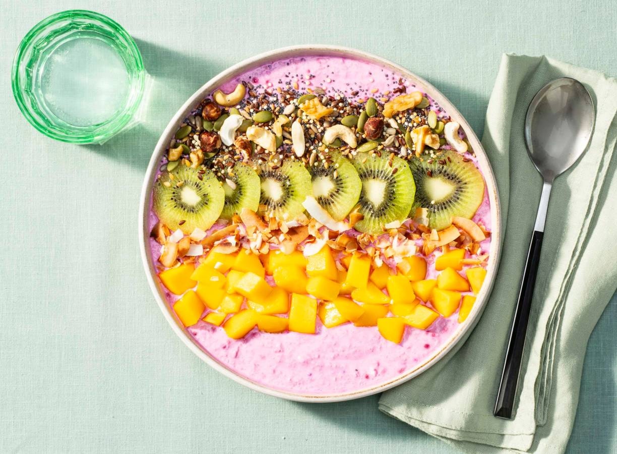 5. Verdeel de smoothie over kommen en verdeel de kiwi, mango, kokos en het noten-zadenpittenmengsel erover.