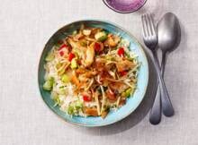 Deze roerbak met plantaardige kipstukjes en knoflookrijst staat in 20 min. op tafel! De ketjap manis zorgt voor een fijn zoetje en de bosuitjes geven een frisse bite. En met maar weinig ingrediënten is het ook nog eens een budget-recept.