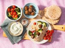 Deze zachte pita's kan iedereen zelf vullen met tomaten, broccoli en heerlijke zelfgemaakte köfte gehaktballetjes. Top ze af met een perfecte saus van gepofte knoflook en verse kruiden. Lekker en gezond!