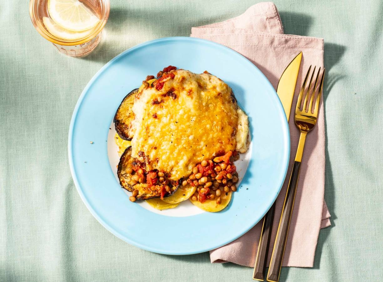 Maak deze aubergine-linzenovenschotel in de airfryer: laagjes aubergine en gekruide linzen, afgetopt met een krokant kaaslaagje. Licht pittig, goed vullend en ideaal om restjes groenten in te verwerken.