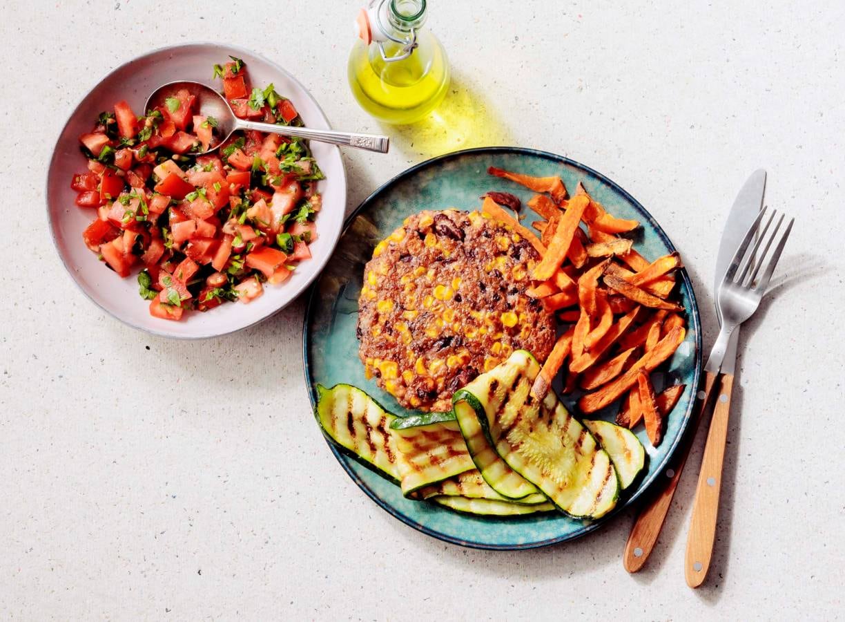 Bonen-maisburger met courgette, zoete aardappelfriet en tomatensalsa