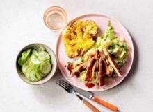 Rucolastamppot met gegrilde bloemkool, hamlappen en komkommersalade