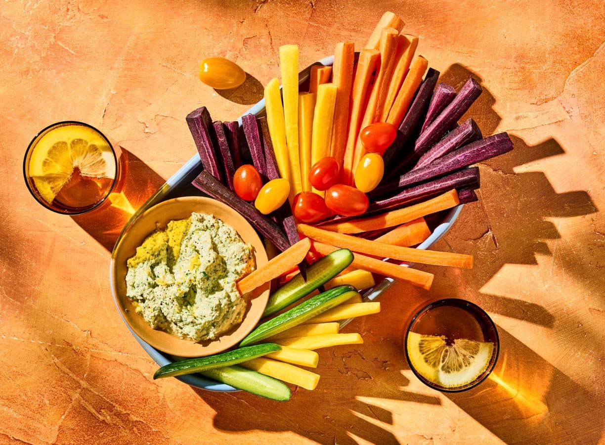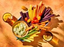 Met deze gezonde crudité van regenboogwortels scoor je pas echt punten. Bonus: ansjovisdip, lekker romige van cottagecheese, knoflook en peterselie.