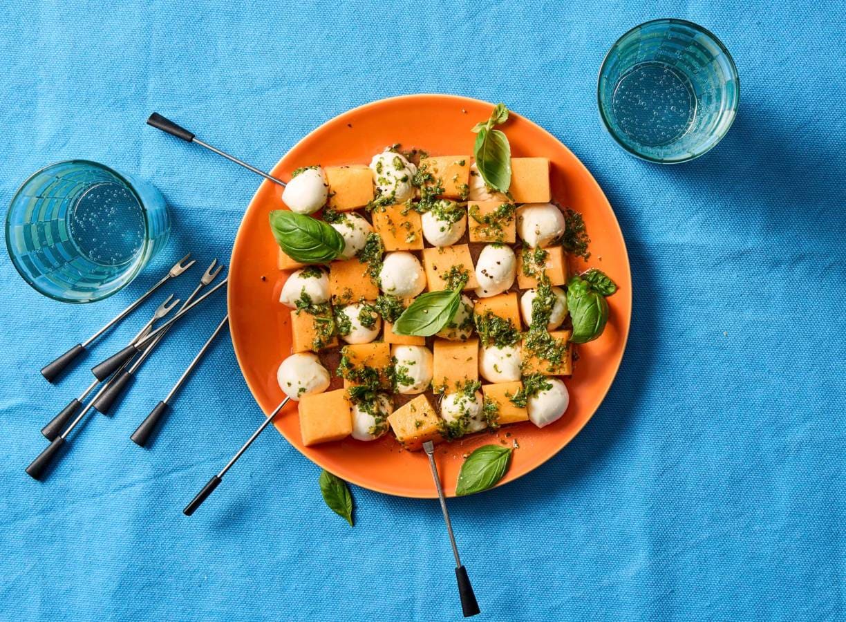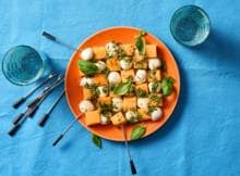 Met dit hapje van meloen en mozzarella zit je helemaal in de team oranje vibes. Plus: het is nog eens een gezond borrelhapje. Win-win!