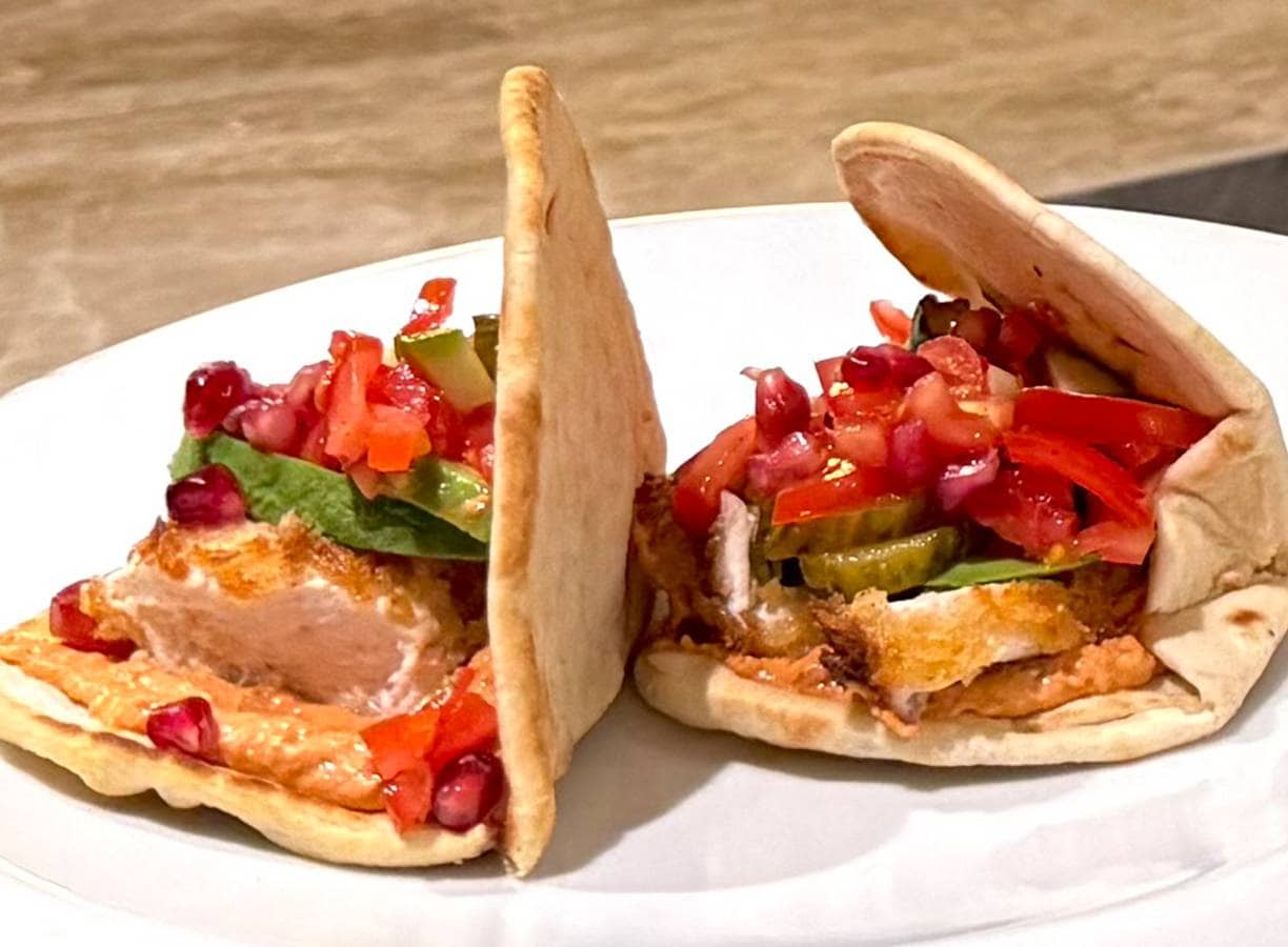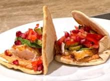 5. Besmeer de flatbreads met de zuivelspread en beleg met de crispy kip, komkommer-tomaatmengsel, avocado en granaatappelpitjes.