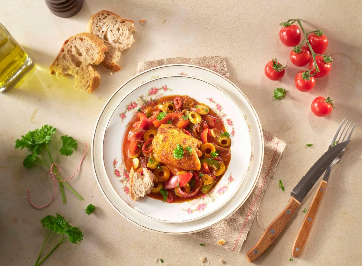 Koken met Heinz: Met Heinz frito basilicum bouw je razendsnel een rijke, kruidige basis voor deze 'Baskische' kip. De saus krijgt meteen die volle, mediterrane tomatensmaak waar je verder niets meer aan hoeft te doen.