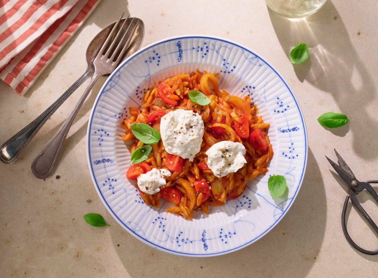 Koken met Heinz: Met Heinz frito basilicum zet je in één pan een romige orzo vol smaak op tafel — makkelijk, snel en heerlijk sappig door de burrata.