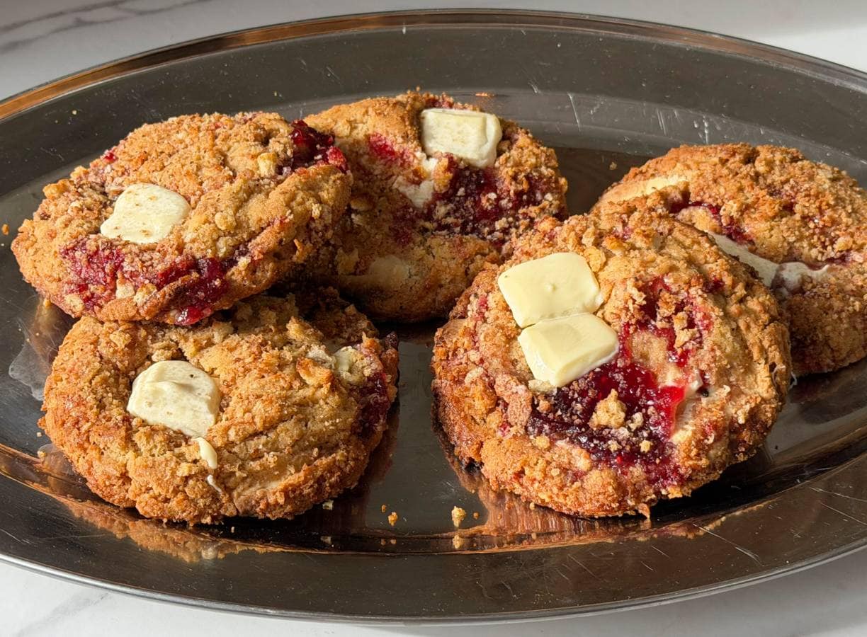 Deze witte-chocoladekoeken hebben een geheim ingrediënt: toast met boter en jam. Geloof ons, dit wil je!