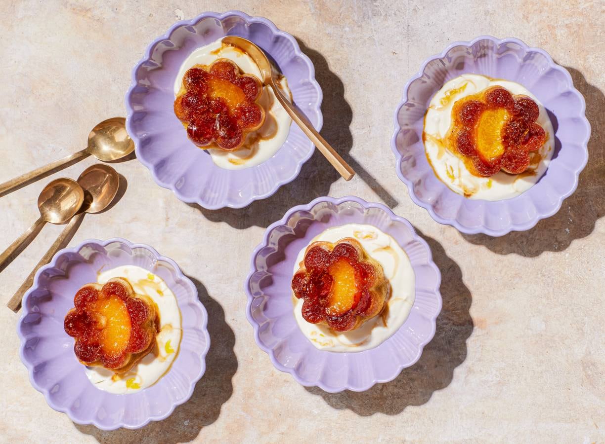 Proef de lente en maak deze kleine, elegante taartjes met perzik als stralend middelpunt voor de paasbrunch. Upside down geserveerd met plantaardige yoghurt. Een vrolijk, indrukwekkend gebakje.