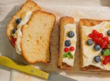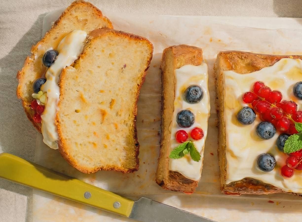 Zacht en luchtig skyrcake in plakjes gesneden, geserveerd met romige skyr, honing en fris fruit. Perfect voor een indrukwekkend ontbijt of brunchmoment.