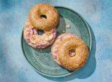Zacht, romig en lichtzoet: deze sesambagels besmeerd met een romige bramen-ricottaspread en belegd met banaan werkt perfect in combinatie met honing. Bestrooi met een vrolijke eetbare bloemetjesmix en zet iets super feestelijks op tafel tijdens de brunch.