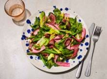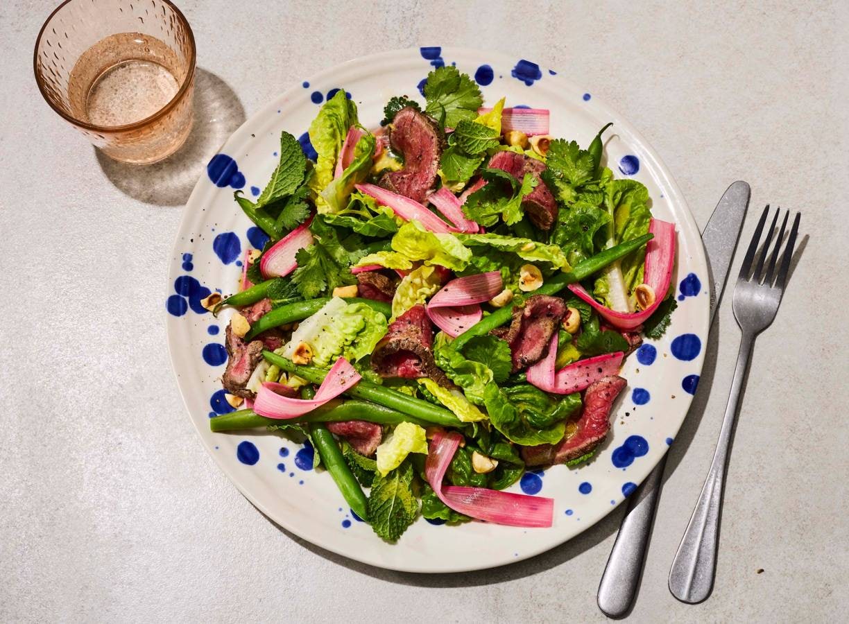 Geef je avondmaaltijd een frisse twist met deze glutenvrije beefsalade: sappige biefstuk, roze rabarberlinten, sperziebonen en knapperige hazelnoten in combi met een bijzondere citroen-dressing. Een zomers gerecht vol heerlijke smaken