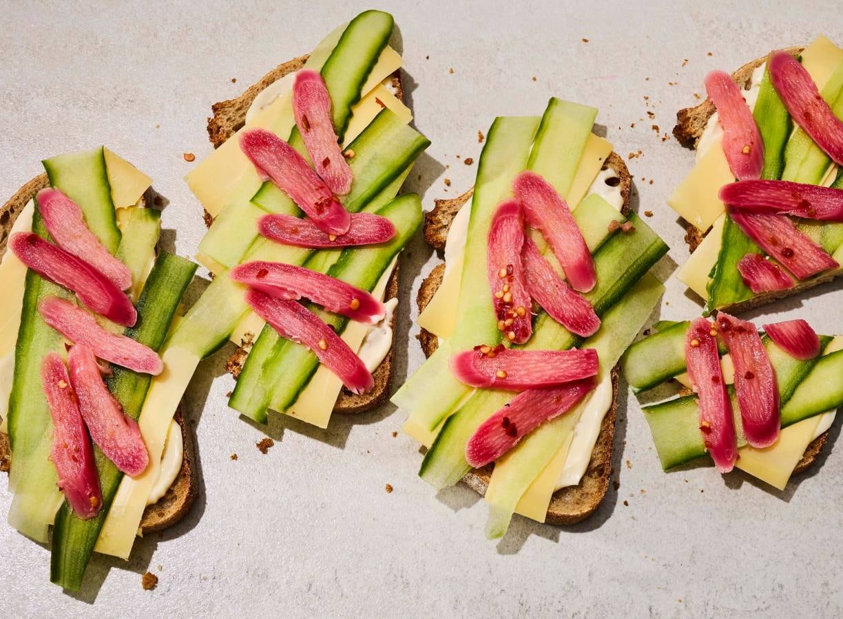 Besmeer de sneetjes brood met de mayonaise. Schaaf plakken kaas en verdeel over de sneetjes brood. Verdeel de komkommer en 4 el rabarberpickle (per 4 personen) over de kaas. Bewaar de rest van de pickle in de koelkast.