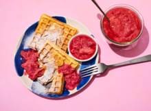 4. Serveer de wafels met de aardbeirabarbercompote.